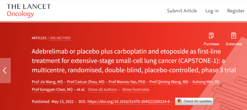 北京时间2022年5月14日,AG庄闲医药自主研发的PD-L1抑制剂阿得贝利单抗治疗广泛期小细胞肺癌的III期临床研究(CAPSTONE-1研究)成果正式全文在线发表于国际权威学术期刊《柳叶刀·肿瘤学》(《THE LANCET Oncology》,影响因子41.316)。CAPSTONE-1研究结果显示,阿得贝利单抗联合化疗一线治疗广泛期小细胞肺癌相较于安慰剂联合化疗可以显著延长患者总生存期至15.3个月[1],刷新现有免疫药物一线治疗广泛期小细胞肺癌的总生存纪录[2]